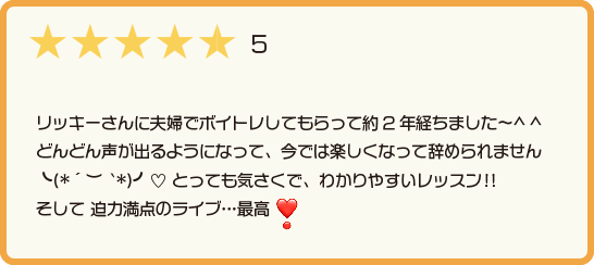 ステージ付きのボーカルレッスンを受けてみませんか? 楽器演奏の方も参加OKです! →生演奏のステージ付きボーカルレッスン詳細はこちらから